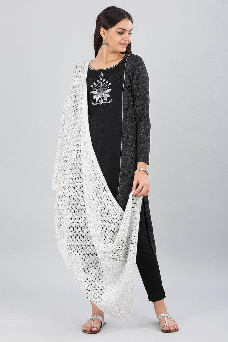 Catch All Eye-Balls On You With This Chic & Flared Set. The Set Has Black Khadi Print Dress In V-Neck And Tie-Up On Sleeves. It Is Paired With Skin Fit Tights.