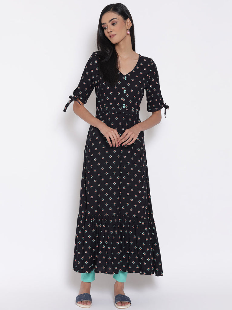Antheracite black coloured khadi dress in floral motifs. This rounded hem dress has V-neck and tie-up sleeves.