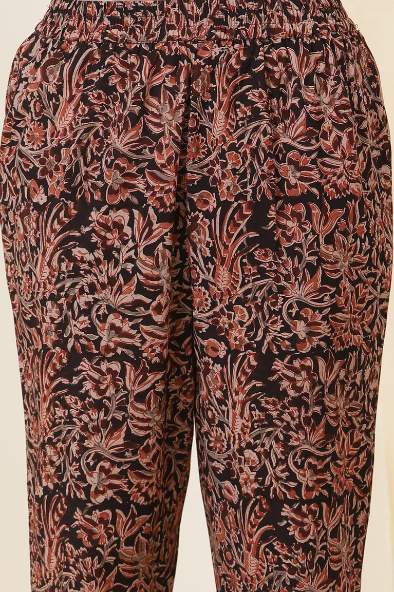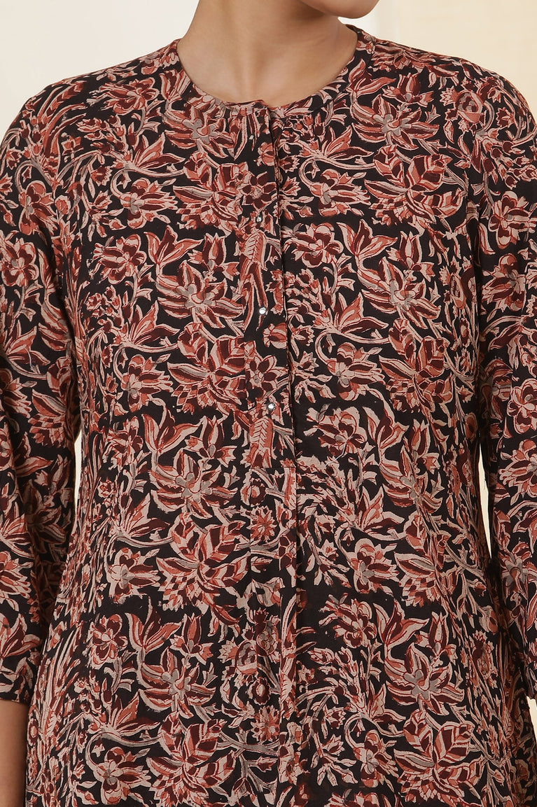 Elevate your casual wardrobe with this black kalamkari printed kurta co-ord set for women from Folksong, a harmonious blend of tradition and modernity. This set comprises a knee-length A-line kurta and mid-rise straight pants, both tailored from 100% pure cotton for breathable, all-day comfort. Designed with a round neckline, 3/4th regular sleeves, and adorned with delicate sequin detailing, the kurta offers a refined aesthetic. The black backdrop enhances the all-over floral print, making it a versatile piece for everyday ethnic wear. The pants come with a drawstring waistband for an adjustable fit. Crafted for Indian summers, this outfit ensures elegance without compromising on ease. Ideal for daytime gatherings, workwear, or casual outings, it’s a timeless addition to your ethnic closet.