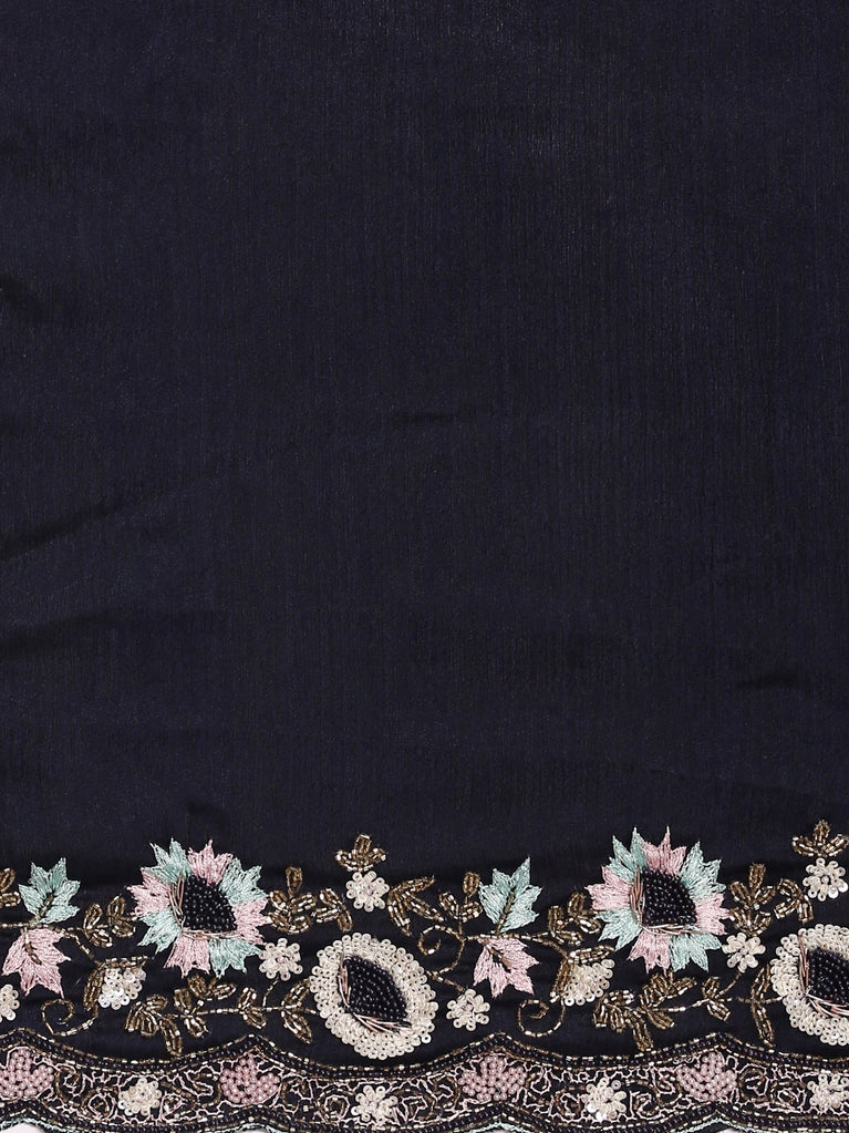 This exquisite Black Jimmy Tissue Saree features delicate hand embroidery, adding an elegant touch to its lightweight and smooth texture. Perfect for formal occasions, its refined craftsmanship ensures a graceful drape, making it a timeless addition to your wardrobe.