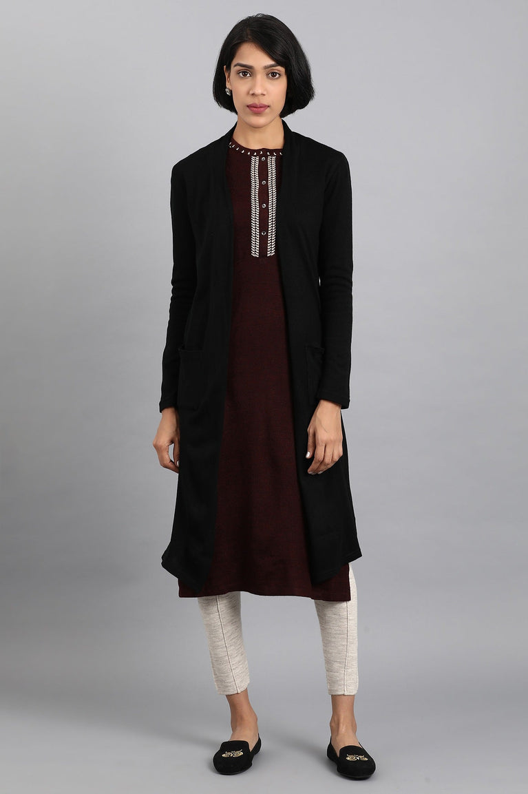 Black coloured solid straight kurta having zari embroidery, mandarin collar with buttoned placket and three-quarter sleeves.