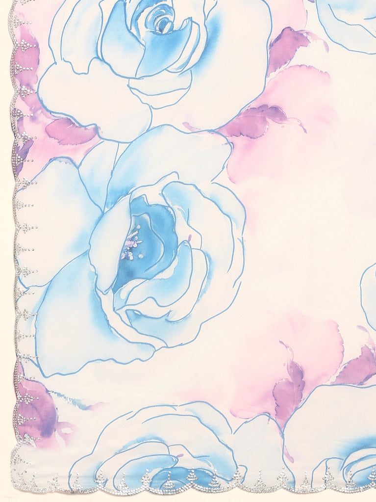 Elevate your traditional wardrobe with this exquisite blue satin saree featuring delicate floral prints. Expertly adorned with Swarovski embroidery, it adds a subtle yet striking sparkle, perfect for special occasions. The smooth satin fabric offers a luxurious drape and comfortable wear, making this saree a sophisticated choice for those who appreciate timeless elegance and exceptional craftsmanship.