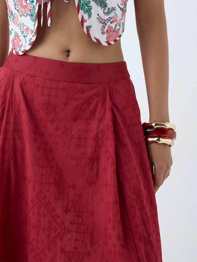 This red skirt from Bombay Paisley is crafted from pure cotton fabric with a crinkle texture. Showcasing embroidered details on a high-rise silhouette, it is completed with a back zipper for easy wearability. A lightweight piece that brings texture and detail to everyday ethnic dressing.