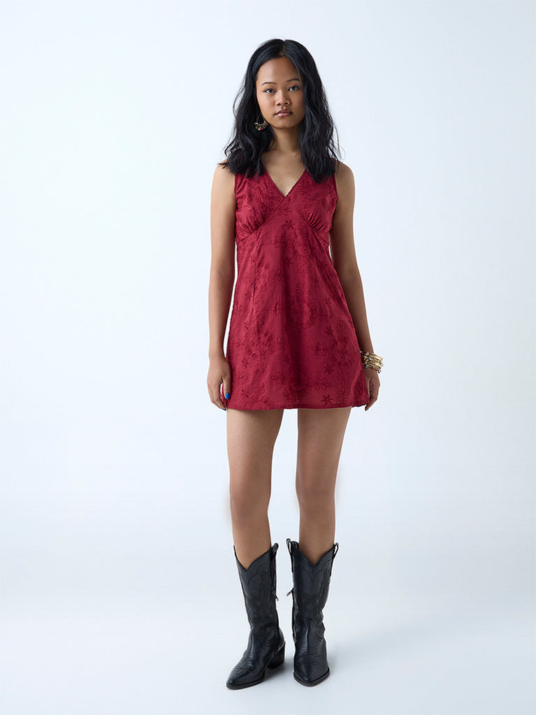 Revamp your wardrobe with this red shift dress from Bombay Paisley. Created from pure cotton, the V-neck creation flaunts intricate floral embroidery that adds a graceful touch to its sleeveless silhouette.