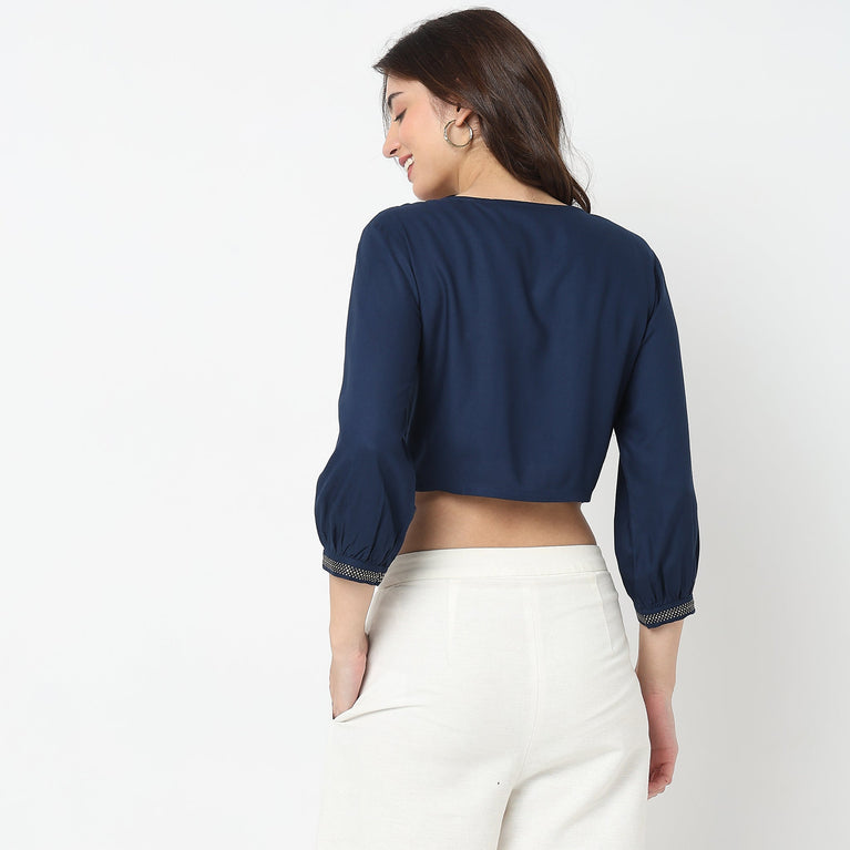 This embroidered pattern top has a v neck and three-fourth sleeve. Made from viscose, it is soft and comfortable to wear.