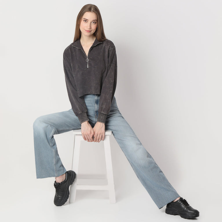 Boxy Fit Cropped Sweat Tee With Quarter Zipper Opening At Neck