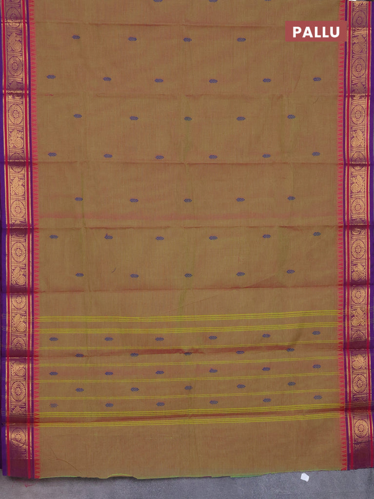 Chettinad cotton saree dual shade of greenish magenta pink and dark mustard with thread woven buttas and thread woven border