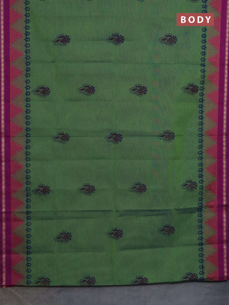 Chettinad cotton saree dual shade of green and purple with butta prints and temple design thread woven border