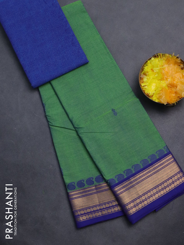 Chettinad cotton saree dual shade of green and blue with plain body and thread woven border