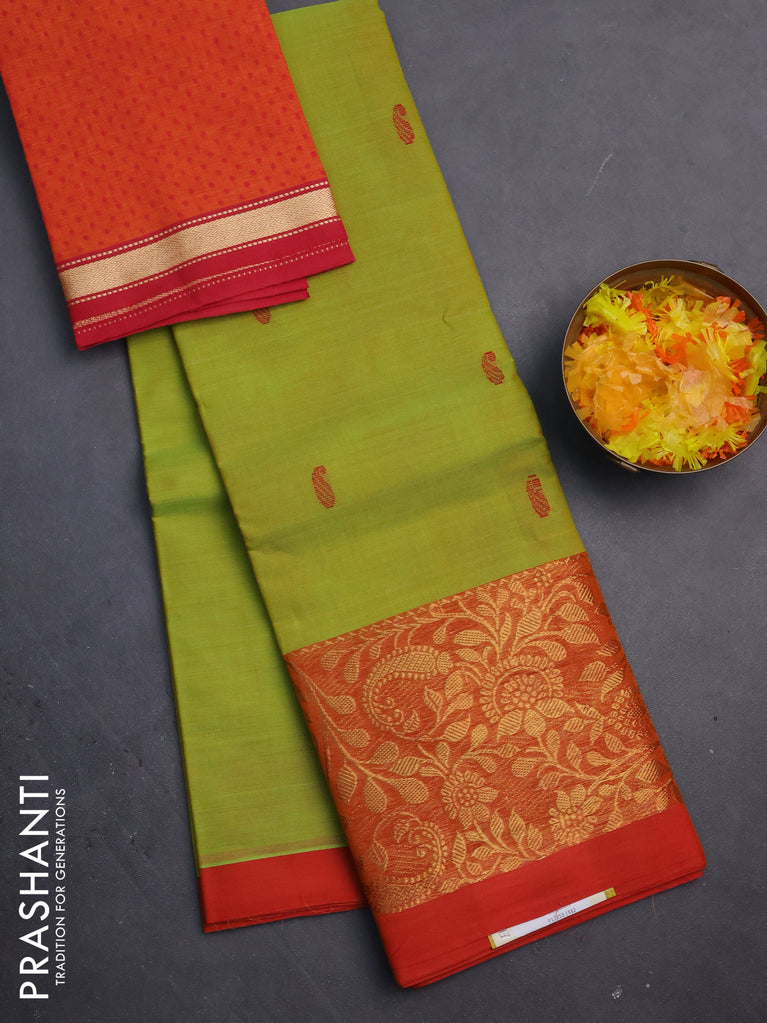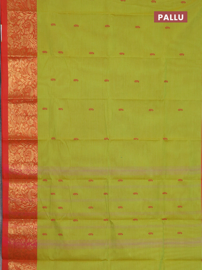 Chettinad cotton saree lime green and red with thread woven buttas and zari woven border