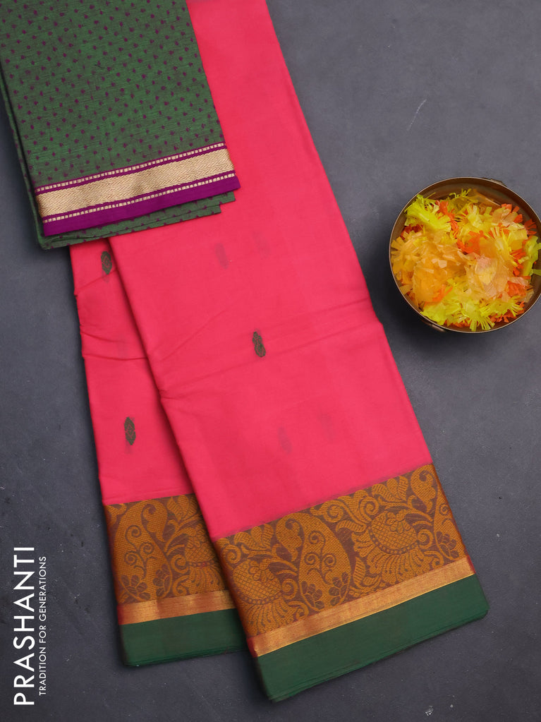 Chettinad cotton saree peach pink and green with thread woven buttas and thread & zari woven border