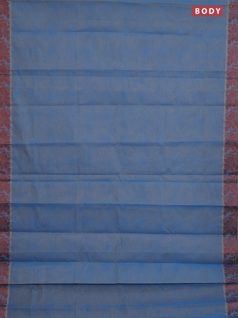 Coimbatore cotton saree dual shade of blue and coffee brown with allover self emboss and thread woven border
