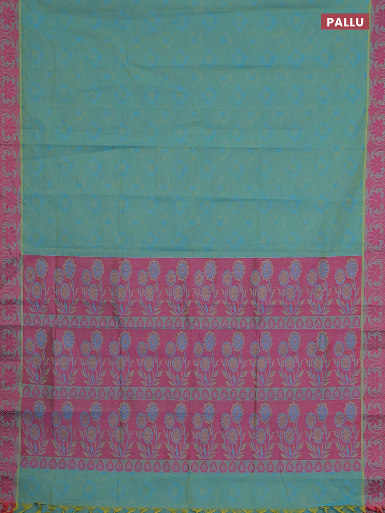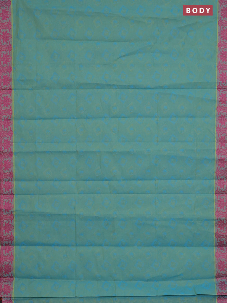 Coimbatore cotton saree dual shade of bluish green and pink with allover self emboss and thread woven border