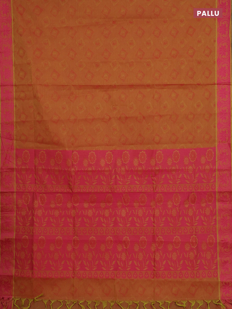 Coimbatore cotton saree dual shade of dark mustard and pink with allover self emboss and thread woven border