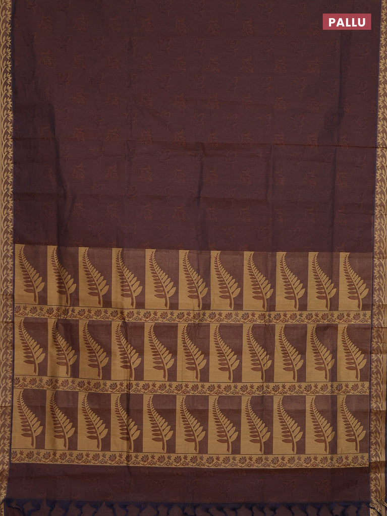 Coimbatore cotton saree dark sandal and brown with allover self emboss and thread woven border