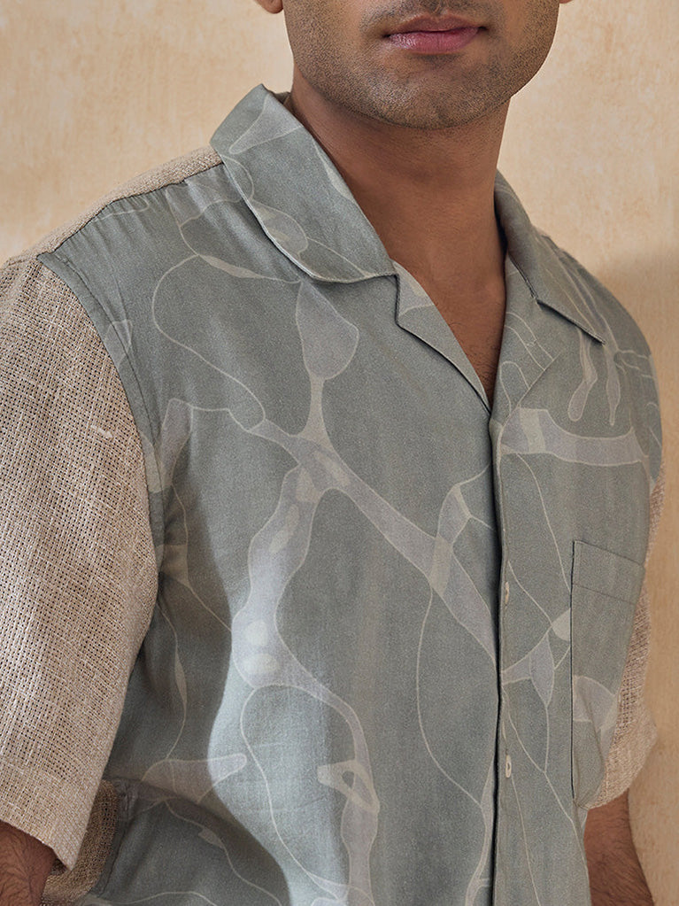 Playful in spirit yet modern in design, this blue shirt reimagines festive dressing with a contemporary twist. A dusty blue body offset by textured sleeves creates a bold color-block effect, while a notched collar and short sleeves keep the silhouette relaxed and easy. Designed for celebrations that spill from day to night, it’s perfect for those who like their festive looks to feel current, confident, and refreshingly effortless.