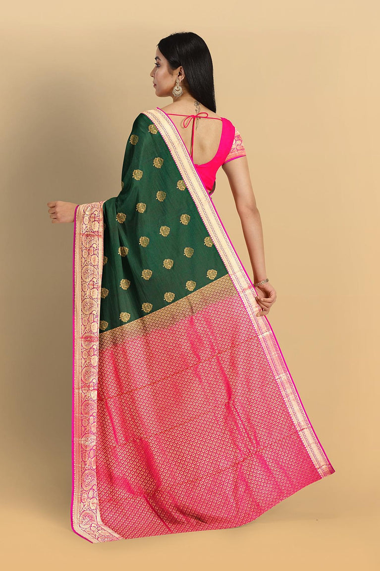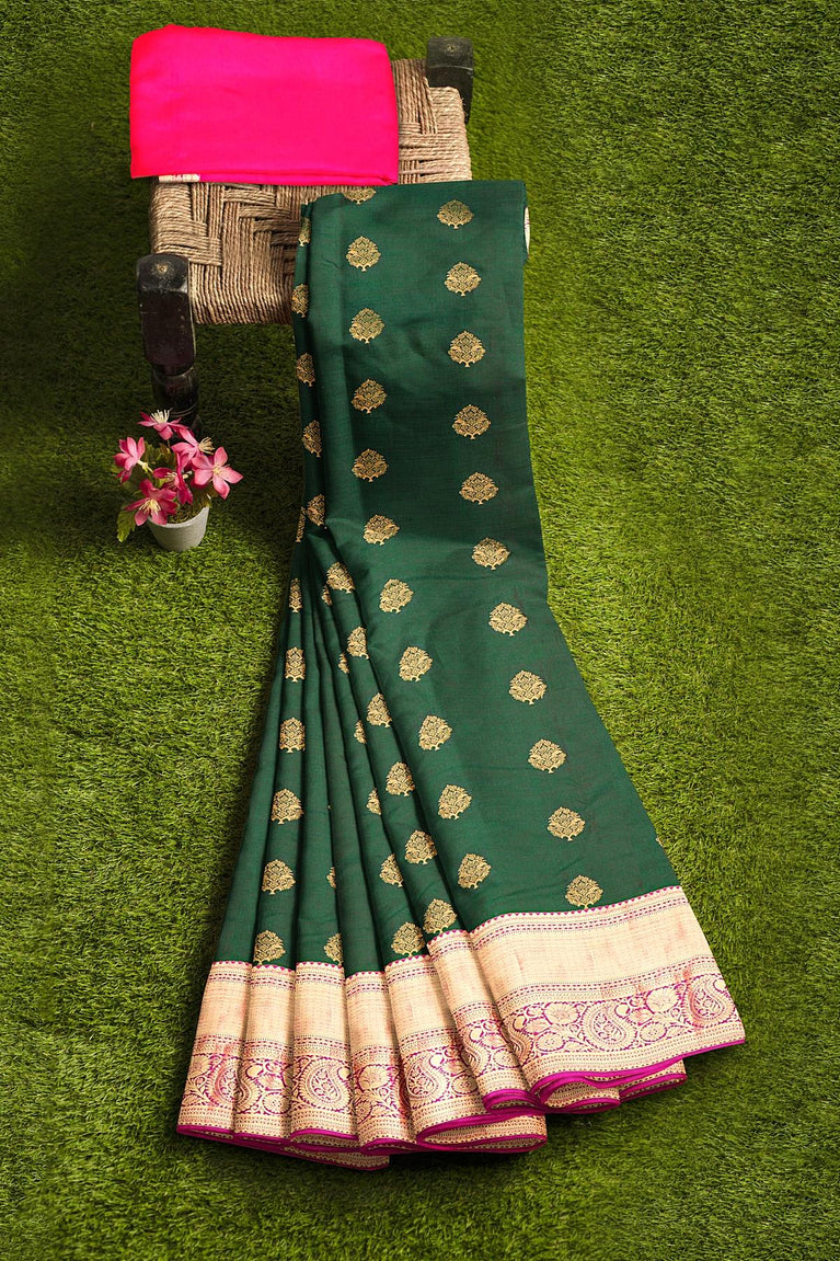 DARK GREEN and PINK BUTTIS SILK BLEND Saree with SEMI PATTU