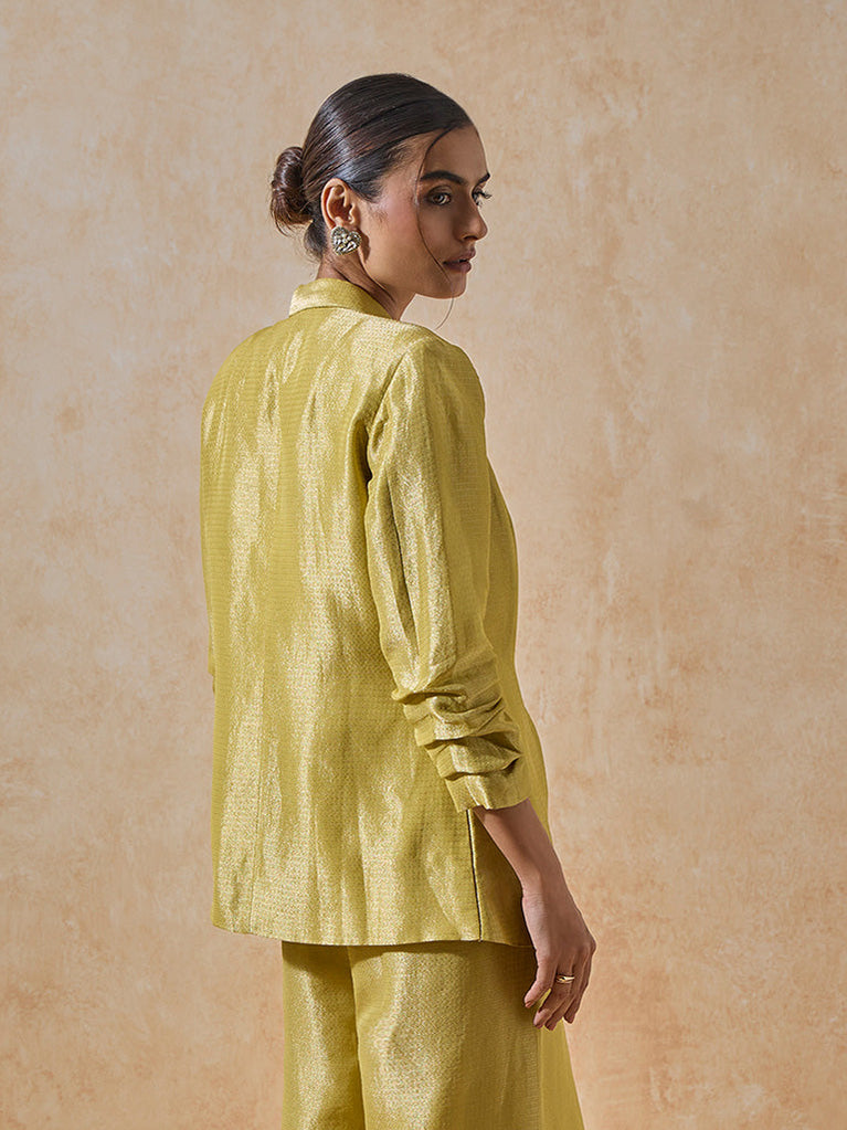 An ode to contemporary glamour, this lime blazer and inner set lights up the room with its metallic sheen and embellished detailing. The single-button blazer features a notched lapel collar, ruched sleeves, and asymmetric embellishment for a hint of drama. Style it with sleek trousers and heels for evenings that blend celebration with edge.