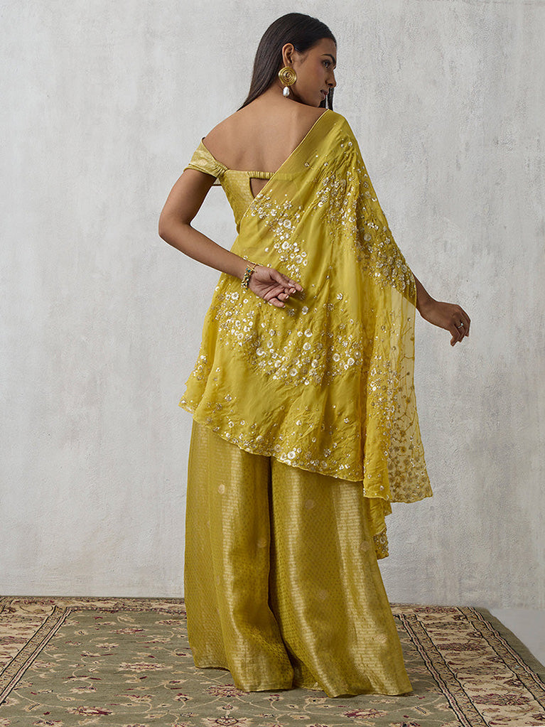 This yellow embellished cape is designed to instantly elevate festive separates. Woven in sheer fabric, it is scattered with sequins and delicate embroidery that catch the light with every movement. Finished with playful tassel ties at the side, it layers beautifully over kurtas, dresses, or blouses to bring a touch of glamour to any celebration.