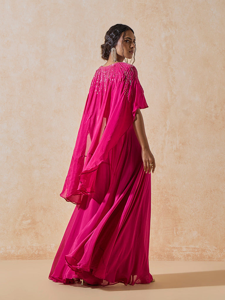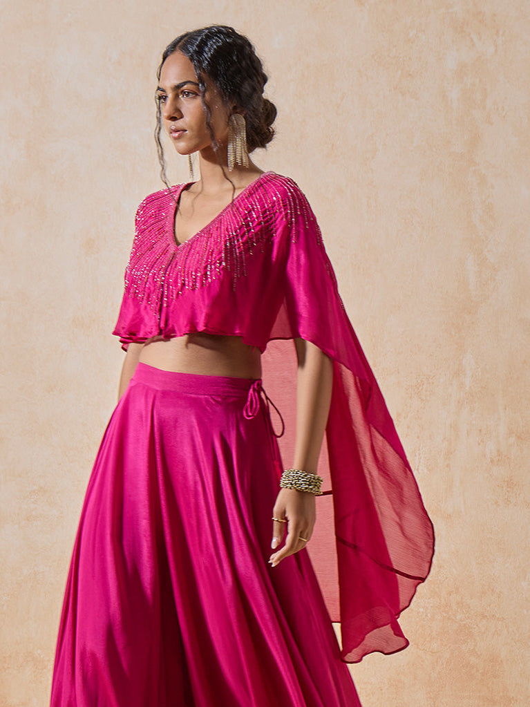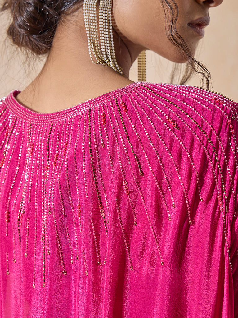 This cropped top brings a fresh twist to traditional wear with its vibrant pink hue and asymmetrical flowy sleeves that offer breezy movement. The V-neckline is beautifully accented with intricate embroidery, adding a touch of artisanal charm. Perfect for pairing with high-waisted skirts or trousers, it’s a versatile piece that blends elegance with ease.