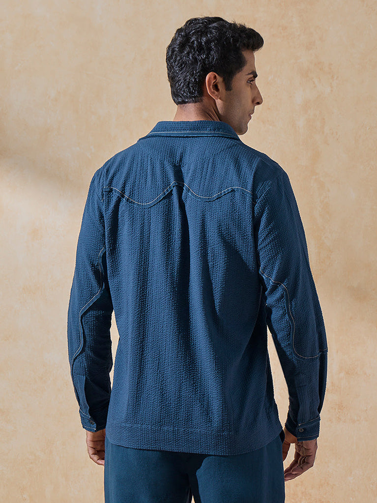 Festive yet modern, this dark blue shirt is styled with ribbed texture and contrast-stitched seams. A classic collar and long sleeves refine the look, making it versatile for day-to-night celebrations.