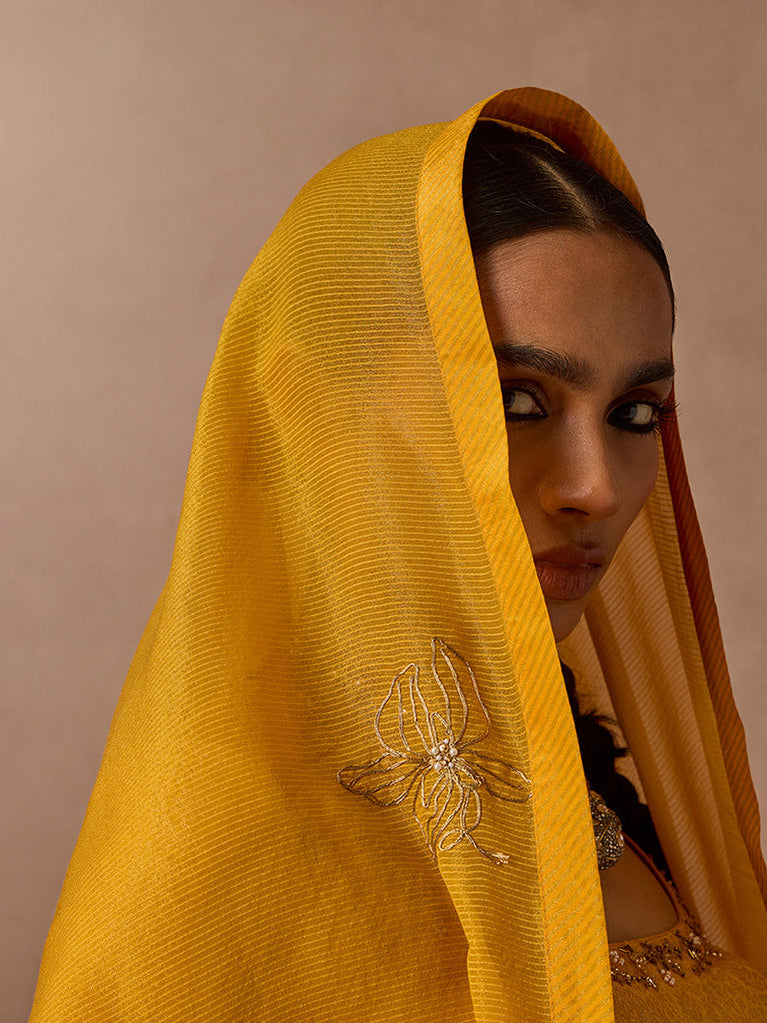 A soft, lightweight dupatta designed to add just the right amount of shimmer and movement to your festive wardrobe. The mustard base carries fine woven vertical stripes that create a gentle sheen, complemented by scattered floral embroidery for a delicate touch. A woven border frames the edges, while the beaded fringe along the sides brings a statement finish that instantly lifts any ethnic ensemble.