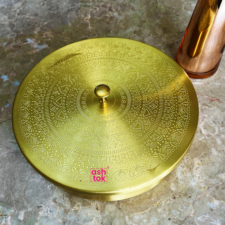Product Details: India is famous for its spices around the world. Almost 6 to 7 spices on average in all dishes daily in the sub-continent. So, it is quite difficult to keep all the spices in separate boxes. If we can have all the spices in one single box, then it will make life easier and more organized. Ashok introduced a masala box with a diameter of the box is 7 Inches and a Height is 2 Inches. The box comes with 7 cups of Diameter of 2 Inches and a Height of 1.25 Inches. The 7 cups are used for different spices. The box is provided with a lid that has floral engraving work on it. The lid is provided with a knob to pull the lid when in use. The box is made of thick brass sheets. The sizes of the cups are such that they get fixed in the box and are not easily movable. This will prevent the spices from spilling out of the box.