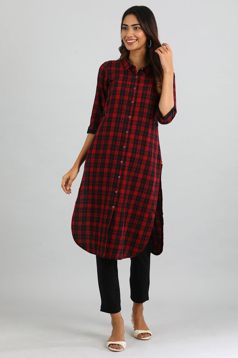 Classic and elegant, this straight dark berry brown kurta comes with an overlapped collar detail with a V-slit. It features a contemporary print that includes decorated florals on top of patterned checks.