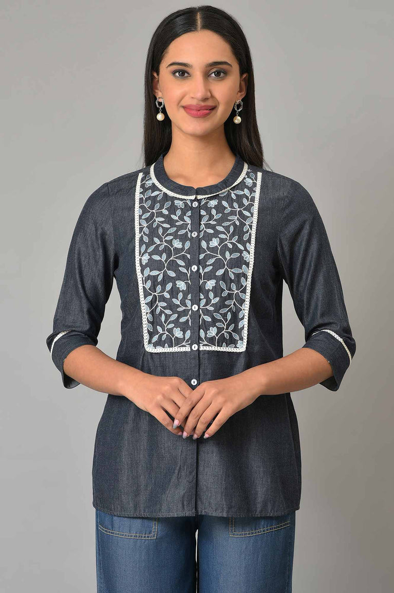 Bringing A Touch Of Delicate Florals To Your Modern Denim kurta With An Elaborate Resham Embroidery On The Yoke. Delve Into This Gorgeous Piece That Is A Perfect Combination Of Style And Comfort By Pairing It Up With Pencil Trousers.