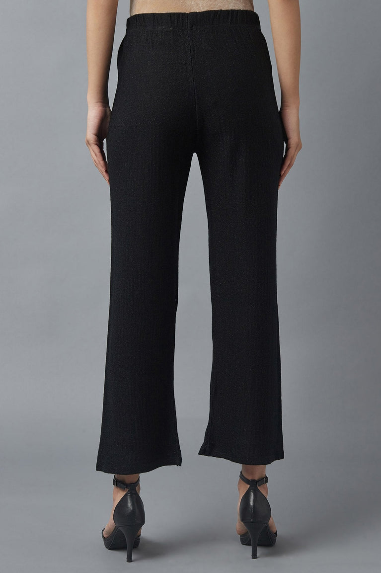 Crafted for effortless elegance, these black knit palazzos feature a subtle shimmer that adds a touch of sophistication to your casual wardrobe. The boot-cut silhouette ensures a flattering fit, while the elasticated mid-rise waist offers unmatched comfort. Perfect for casual outings or evening gatherings, these palazzos pair beautifully with a tucked-in top or a flowy blouse for a chic look.