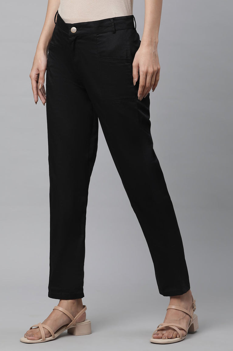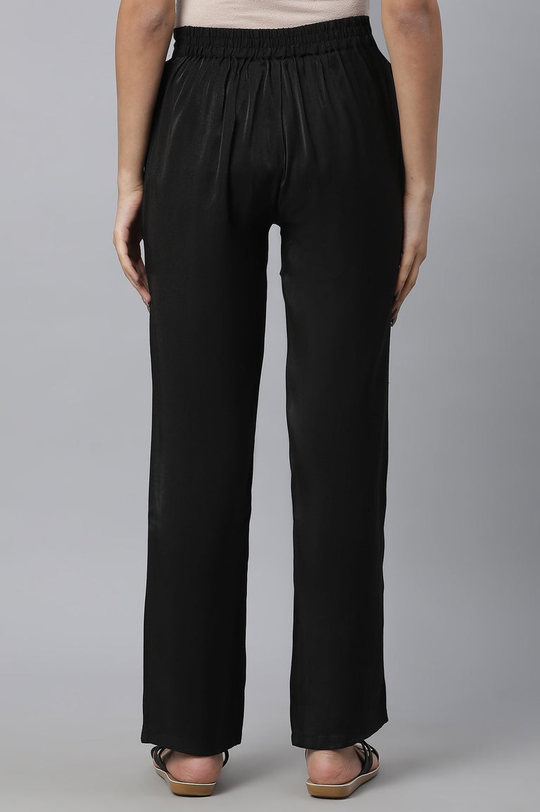 Black Solid Straight Fit Cotton Pants With Elasticated Back