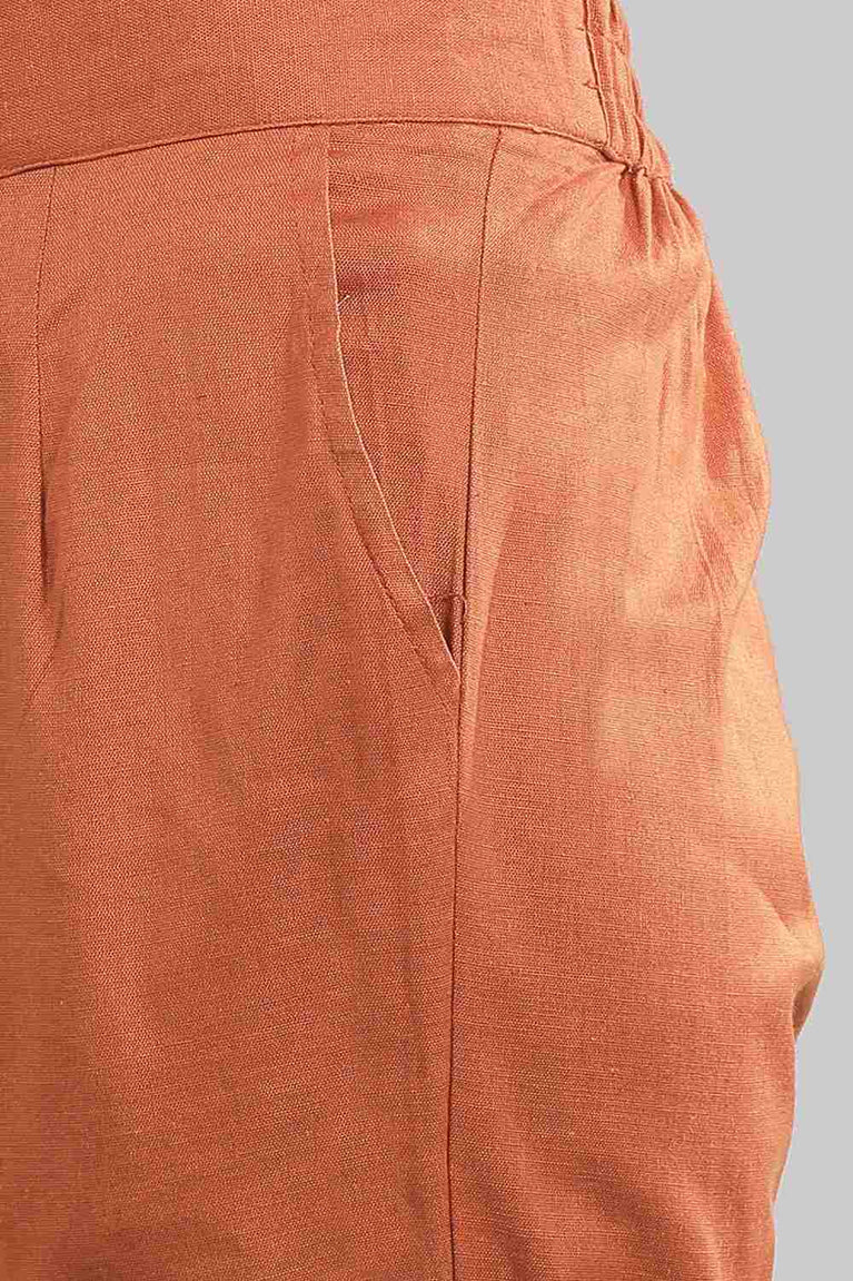 Brown solid trousers with roll up hem and pockets.