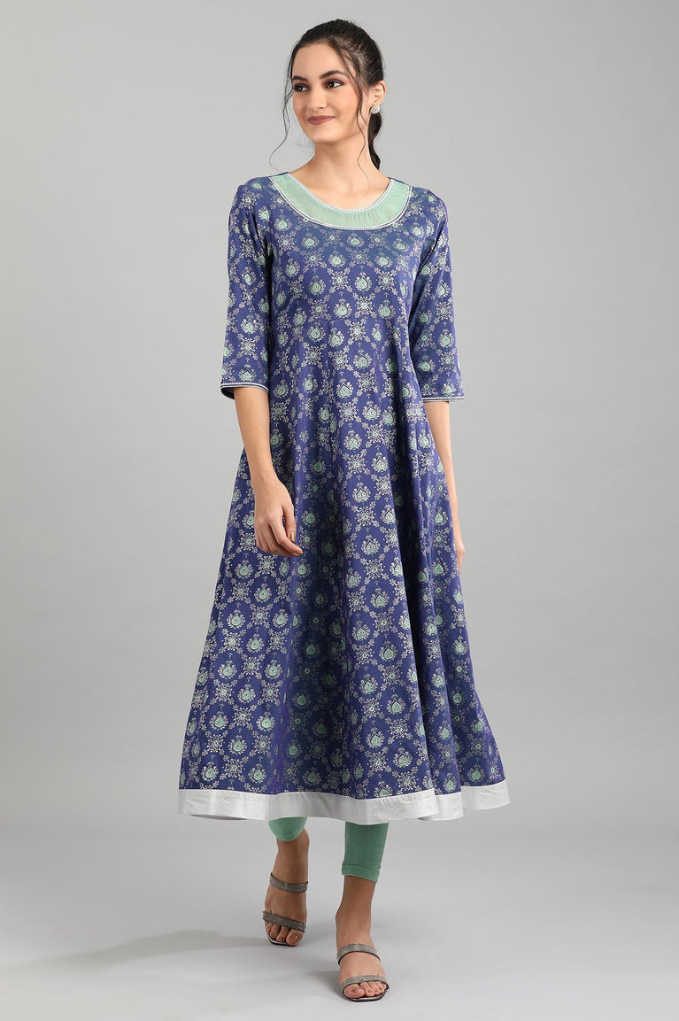 This blue round neck 3/4 sleeve ankle-length kurta has printed detail, flared hem and border detail around neck and hem.