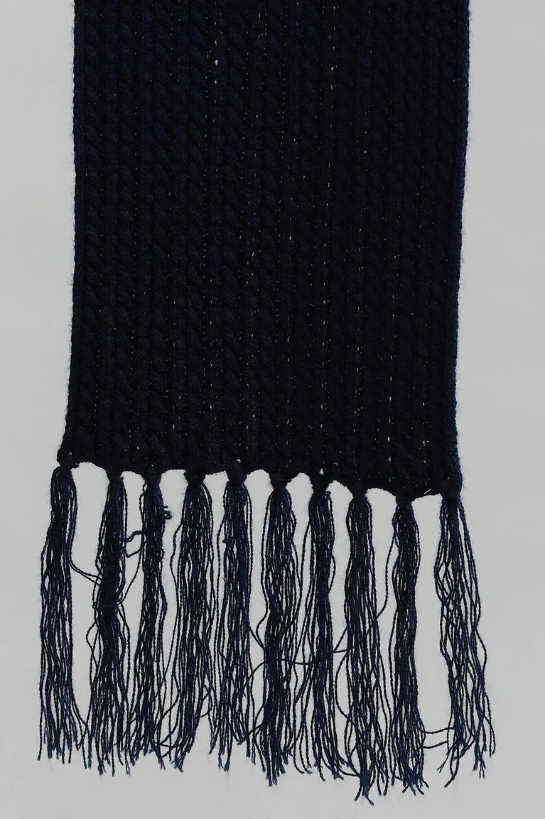Blue yarn-dyed muffler with tassels on both sides.
