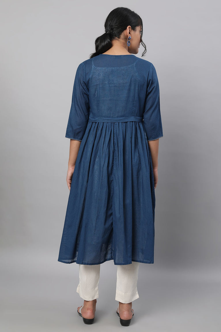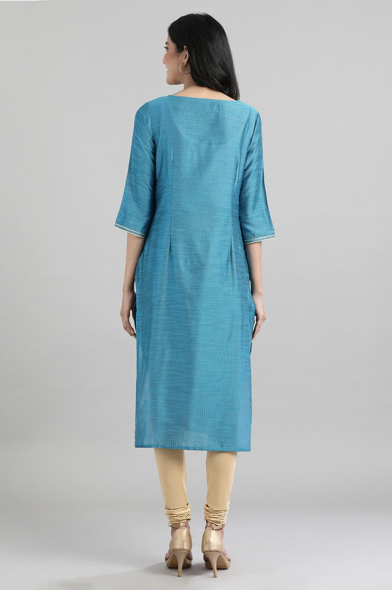 This blue round neck yarn-dyed kurta has side slits and straight hem.