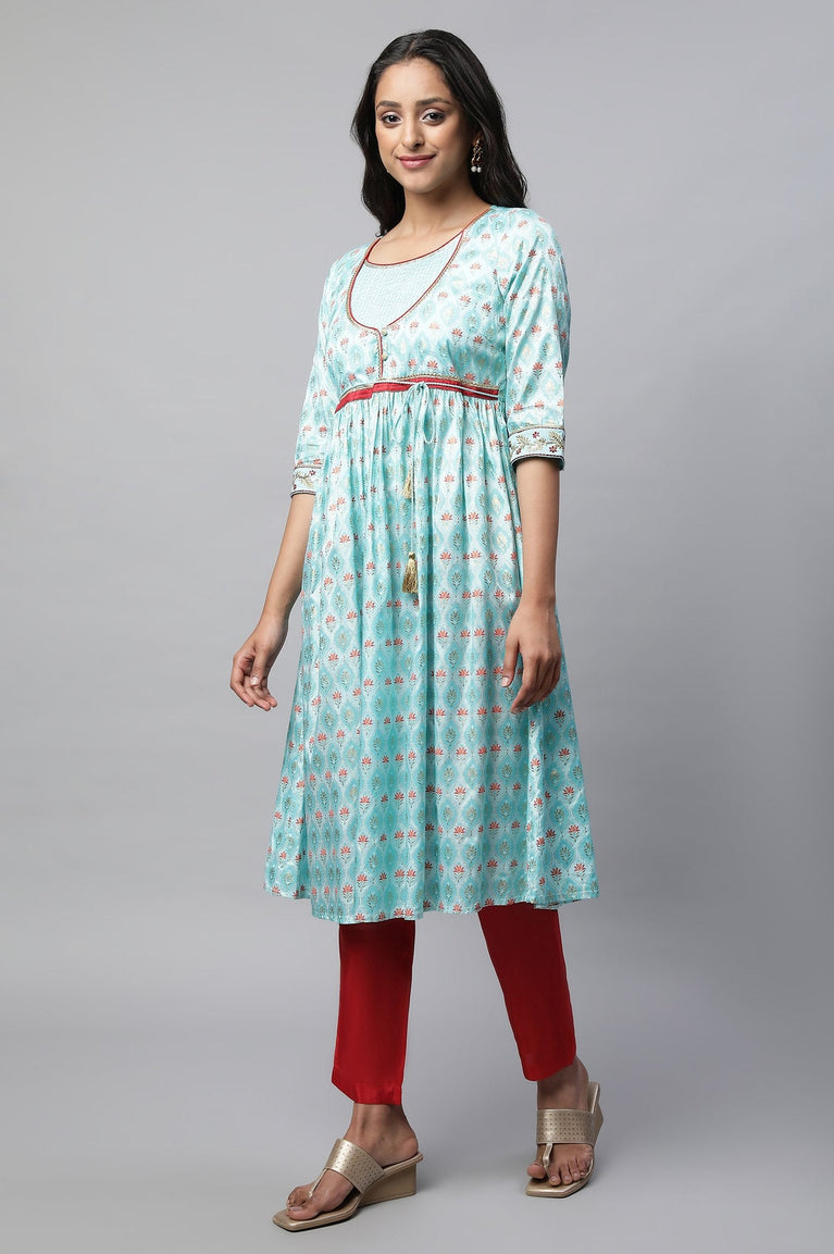 This stylish contemporary set is a must-have for your summer wardrobe. This set includes blue fit and flare Gillet with gathers. The set also includes printed strappy kurta and solid trousers.