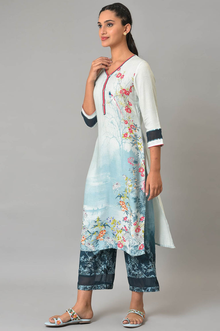 Step out in style for a casual day out or a elevate your office wardrobe with this modern ethnic kurta set. The set includes blue solid straight fit kurta with printed front panel and it is paired with solid trousers.