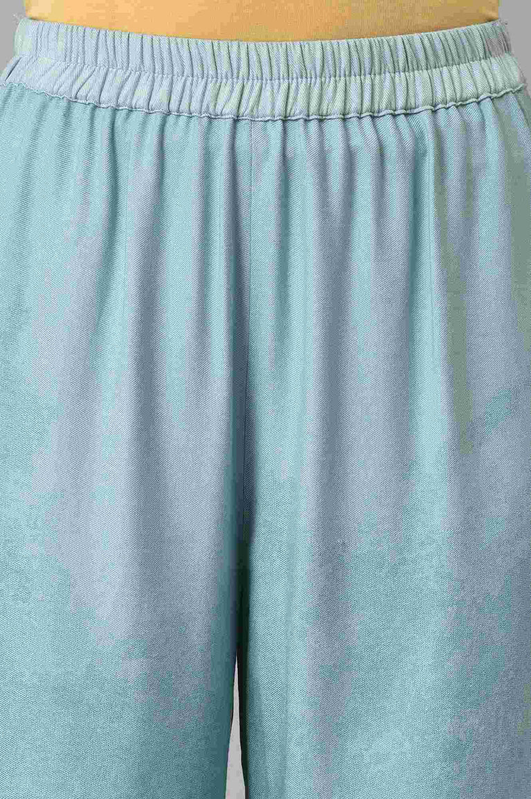 Get a smart office lunch look in this pretty and chic blue gathered kurta set. The set has solid cotton kurta with elegant details. It is paired with grey solid trousers.
