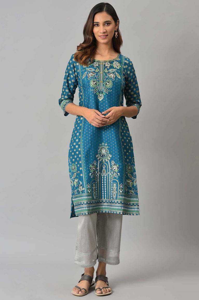 Blue geometric print straight kurta in round neck and 3/4th sleeves