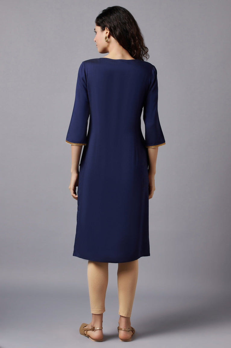 Indulge in the timeless elegance of this dark blue embroidered kurta, made with a viscose poly fabric for a rich and lustrous look. The round neck is accentuated with cutout and tab detail, enhanced with contrast piping for a chic look. The intricate embroidery work adds a touch of sophistication to the overall design.