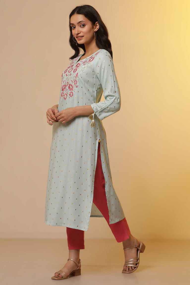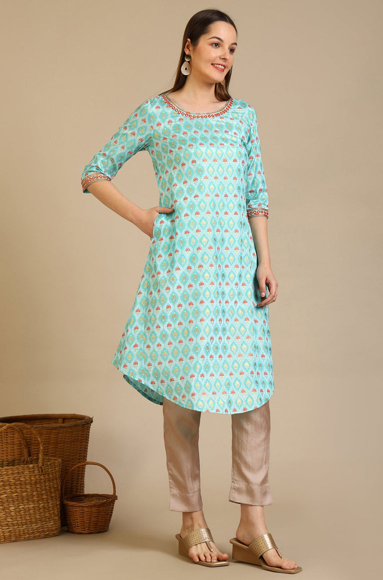 Discover effortless elegance with this Aurelia aqua-colored kurta, perfect for casual occasions. Crafted using a woven construction technique, this fusion-style piece features a sophisticated band neckline and practical three-quarter sleeves. The below-knee length and straight silhouette create a flattering profile, while the slit detail adds a touch of modern flair. Made from a luxurious blend of 60% modal fabric, this kurta offers both comfort and style. The versatile design makes it an ideal choice for women looking to elevate their everyday wardrobe with a hint of ethnic charm. The viscose composition ensures breathability and a soft feel against the skin, making it suitable for all-day wear. Whether paired with leggings or palazzo pants, this Aurelia kurta is sure to become a staple in your casual wear collection.