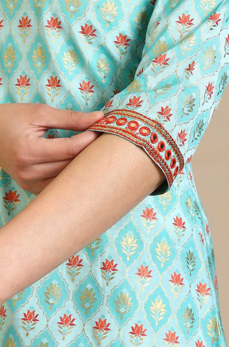 Add a touch of timeless grace to your wardrobe with this beautiful straight kurta for women crafted in natural cambric fabric. Featuring an all-over floral print in subtle earthy tones on a soothing pastel blue base, this kurta is a perfect blend of comfort and style. The soft texture and lightweight weave of cotton make it ideal for casual outings, summer get-togethers, and daytime festivities. Thoughtfully designed with 3/4th sleeves, a v neckline with embroidered detailing, this kurta brings effortless charm to your everyday ethnic collection.