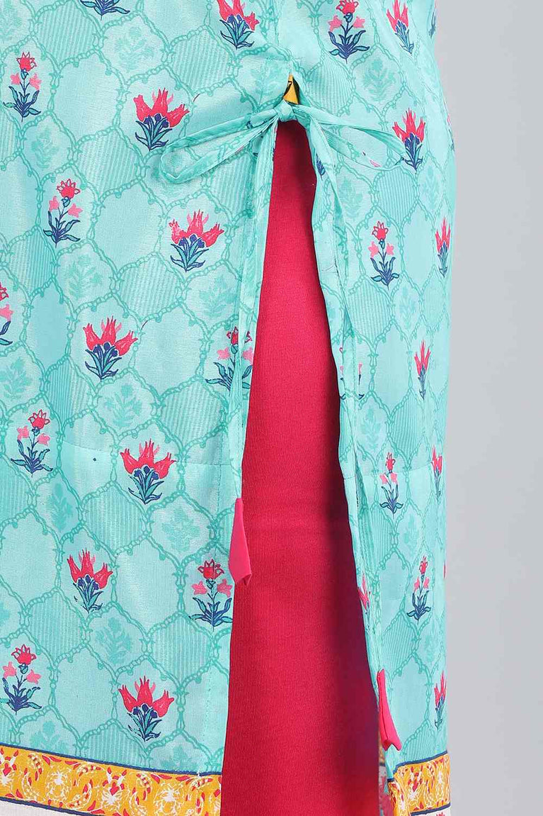 Give Your Casual Wear Collection A Stylish Upgrade With This Ice Blue Placement Printed, Straight kurta. It Features The Perfect Blend Of Playfulness And Simplicity. The Contrast Neck Binding With A Top Stitch, Lace Insert And Mini Cutout Uplifts The Look..