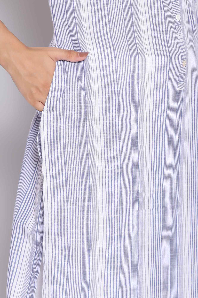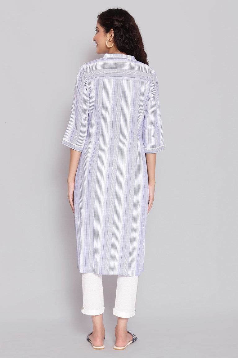 Blue coloured yarn-dyed straight kurta having striped print. This 100% cotton kurta has a mandarin collar with buttoned placket, three-quarter sleeves and side slits.