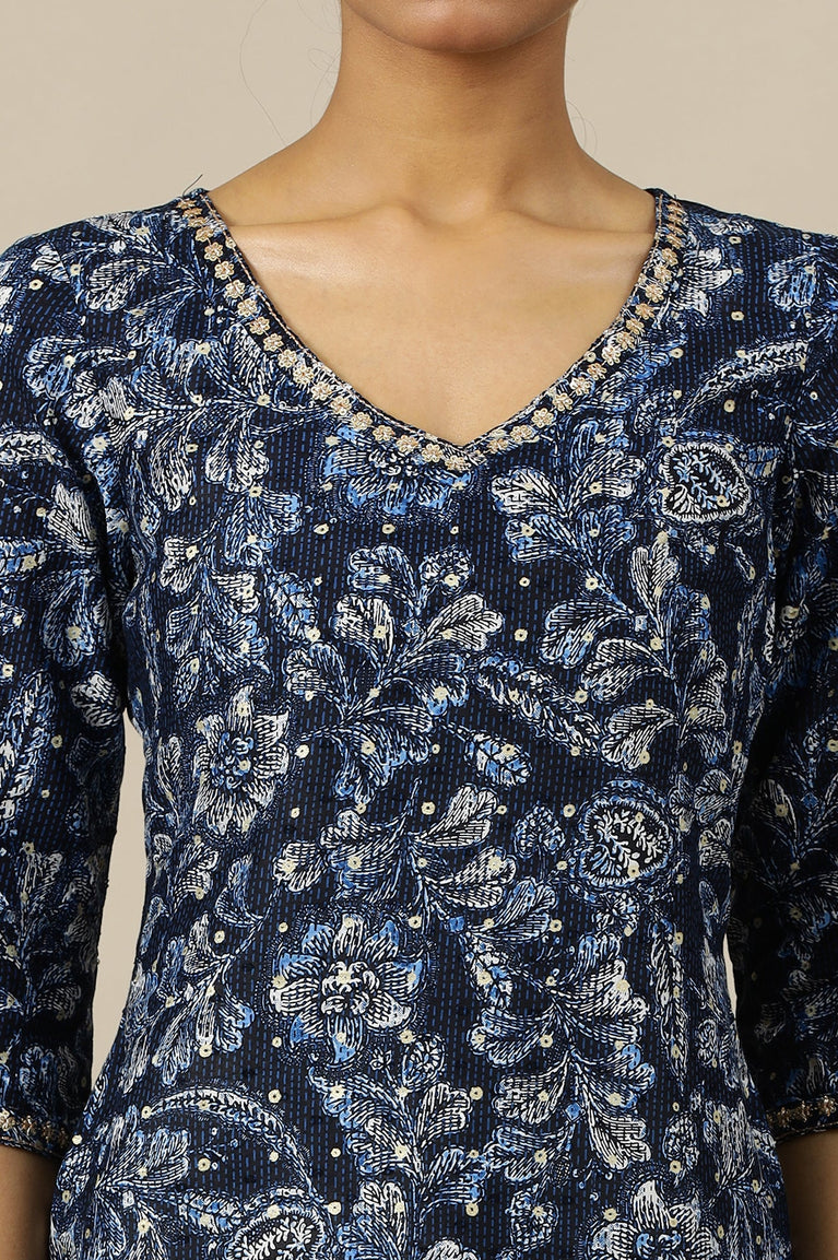 Blue Floral Printed Straight Kurta