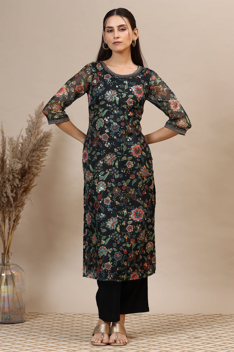Black Floral Printed Straight Kota Kurta with Embroidered Neckline