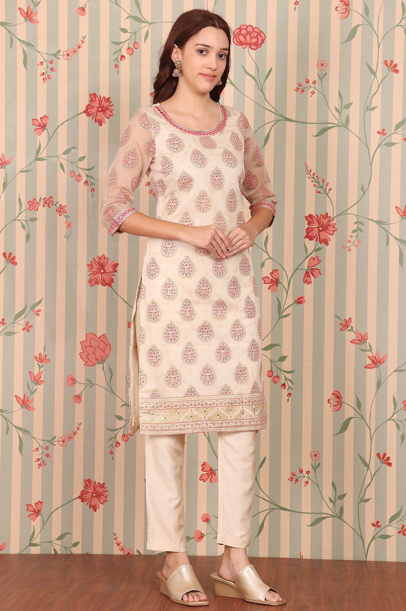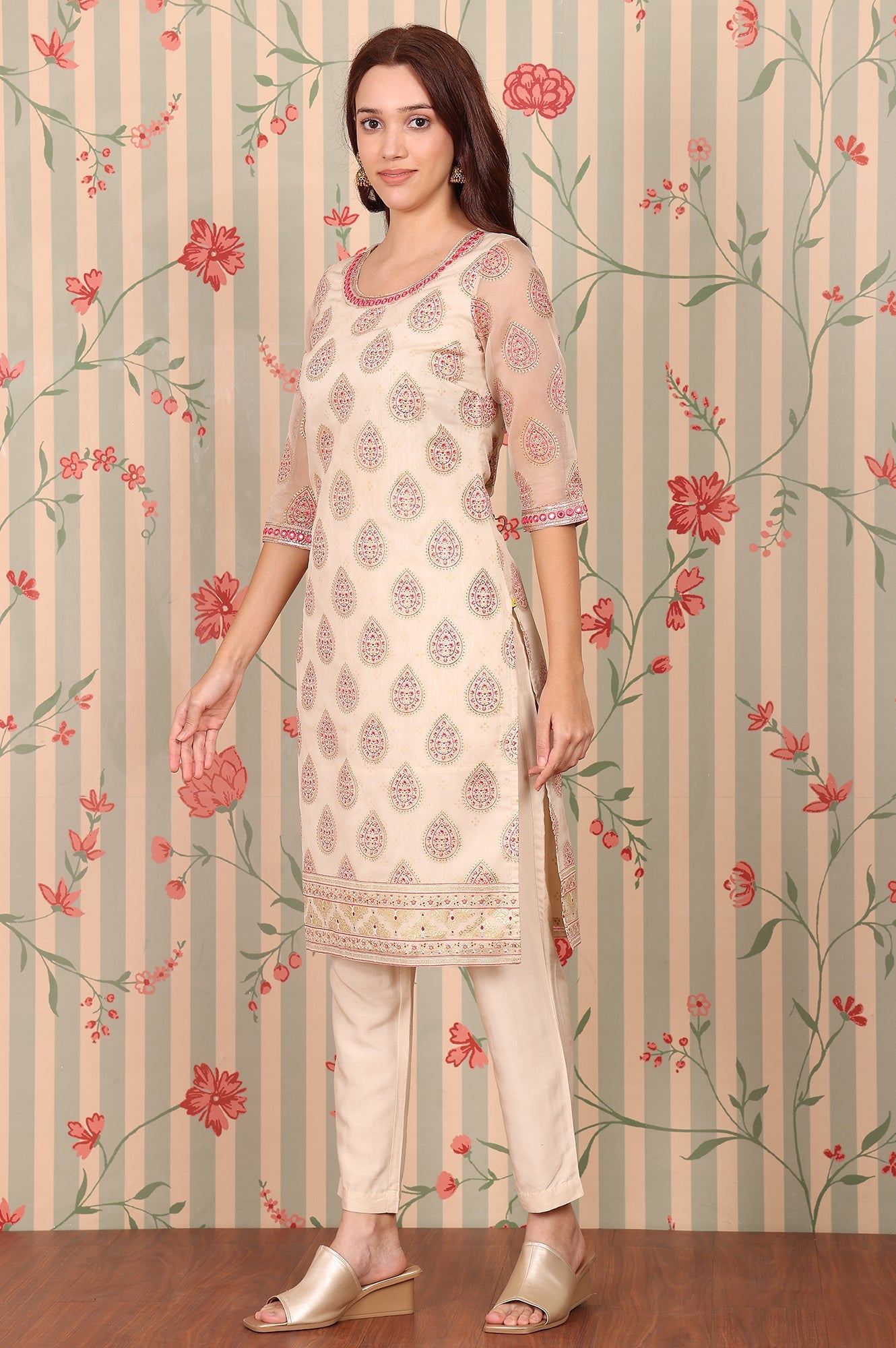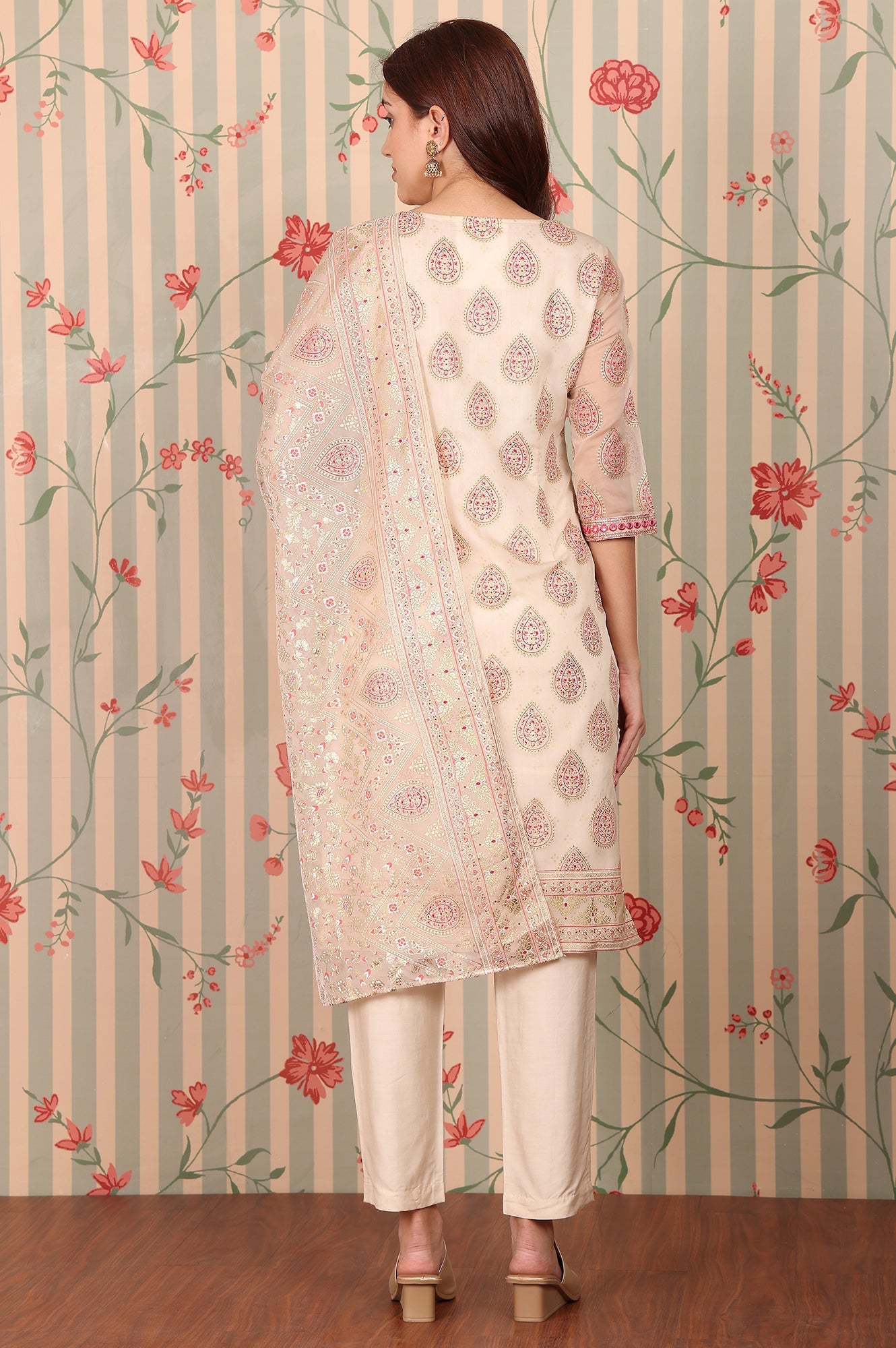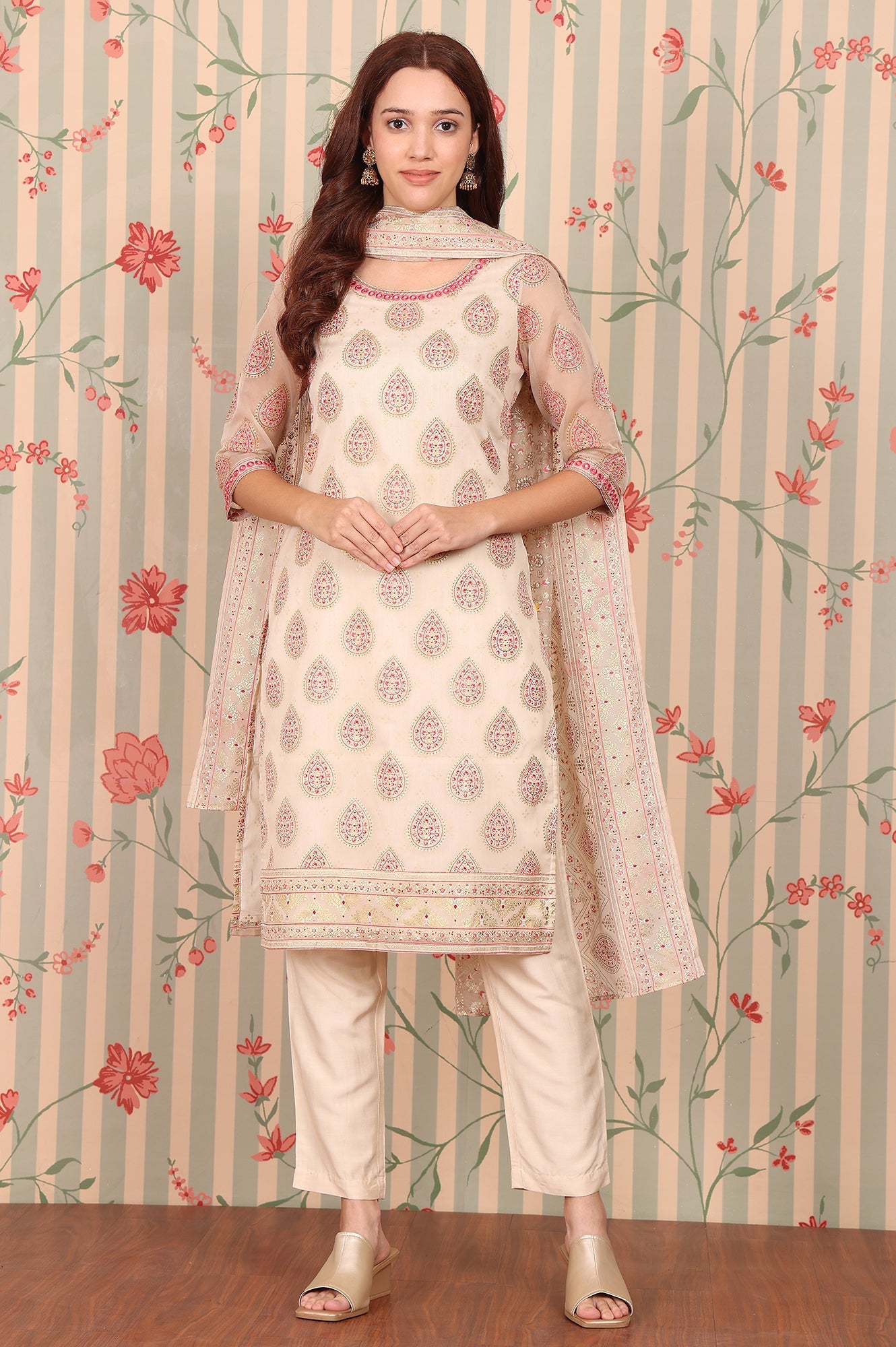 Beige Abstract Printed Embroidered Kurta, Trousers and Dupatta Set
