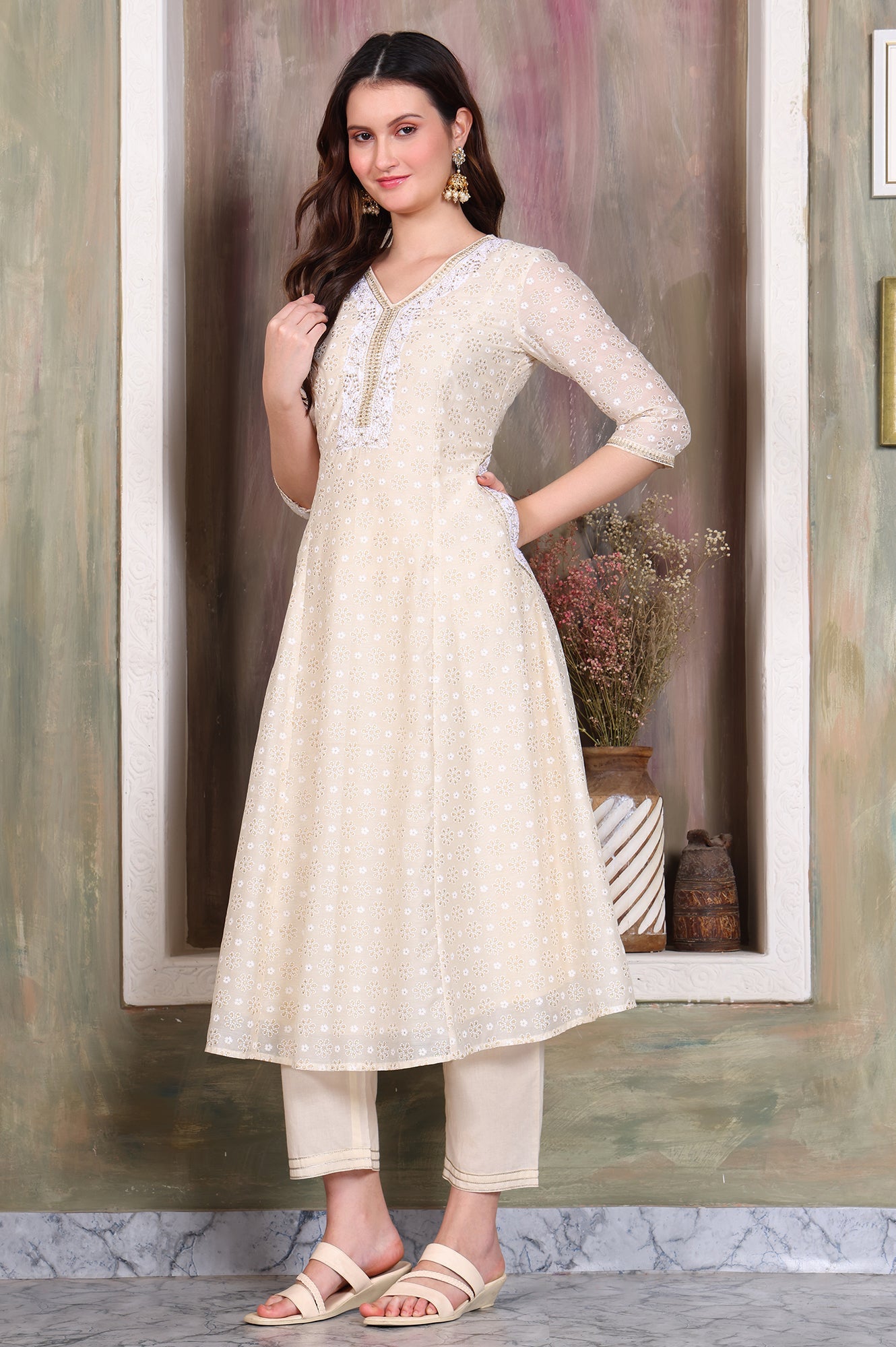 Beige Foil Printed Sequinned A-Line Kurta, Pant and Stole Set