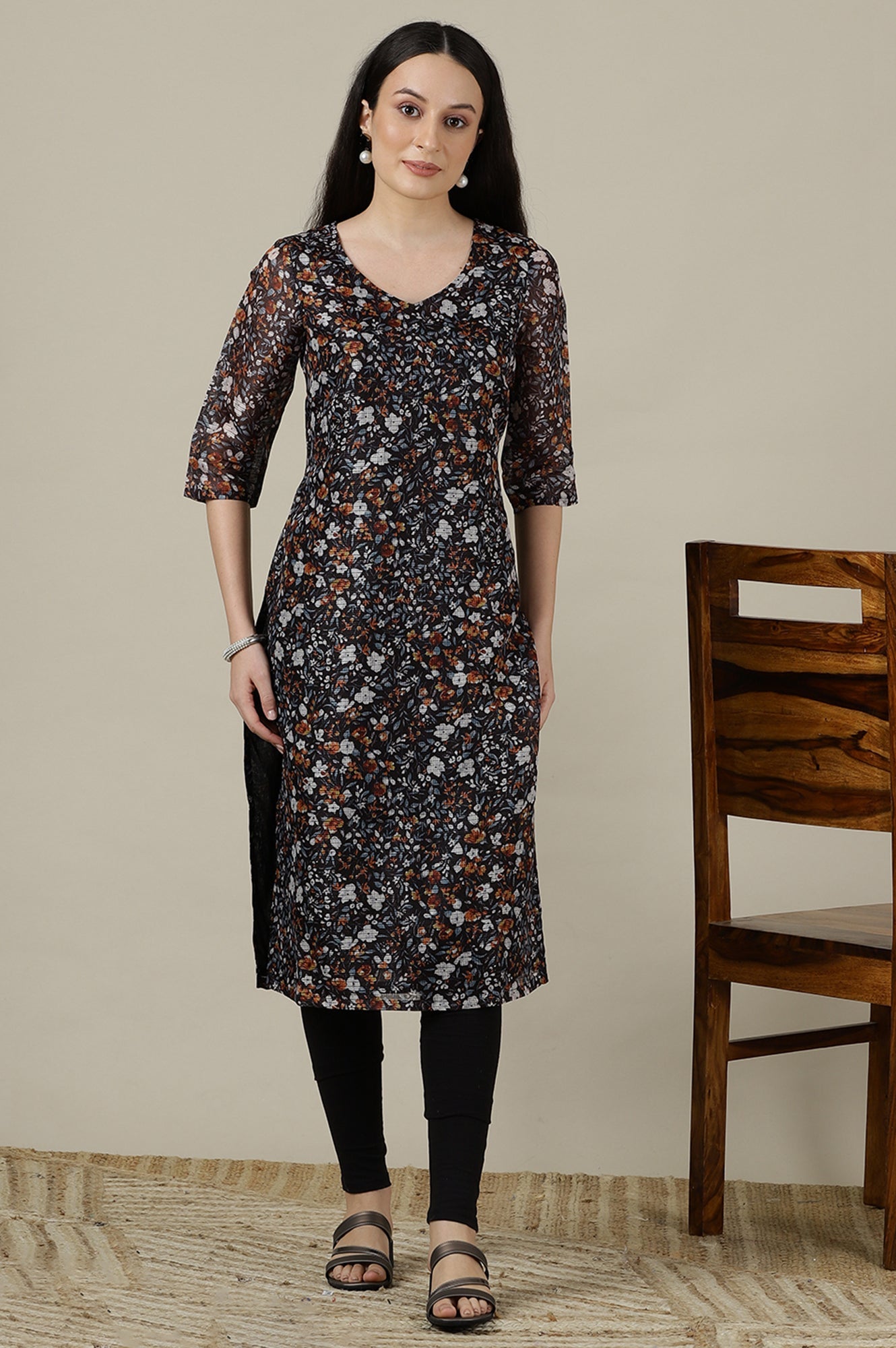 Made in breezy kota fabric, this kurta features delicate floral prints on a deep black base. The straight silhouette, V-neckline, and three-quarter sleeves make it a lightweight and flattering choice for daytime dressing.