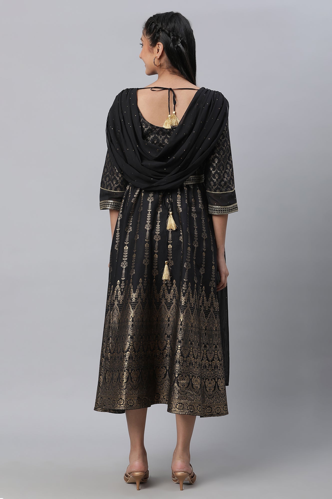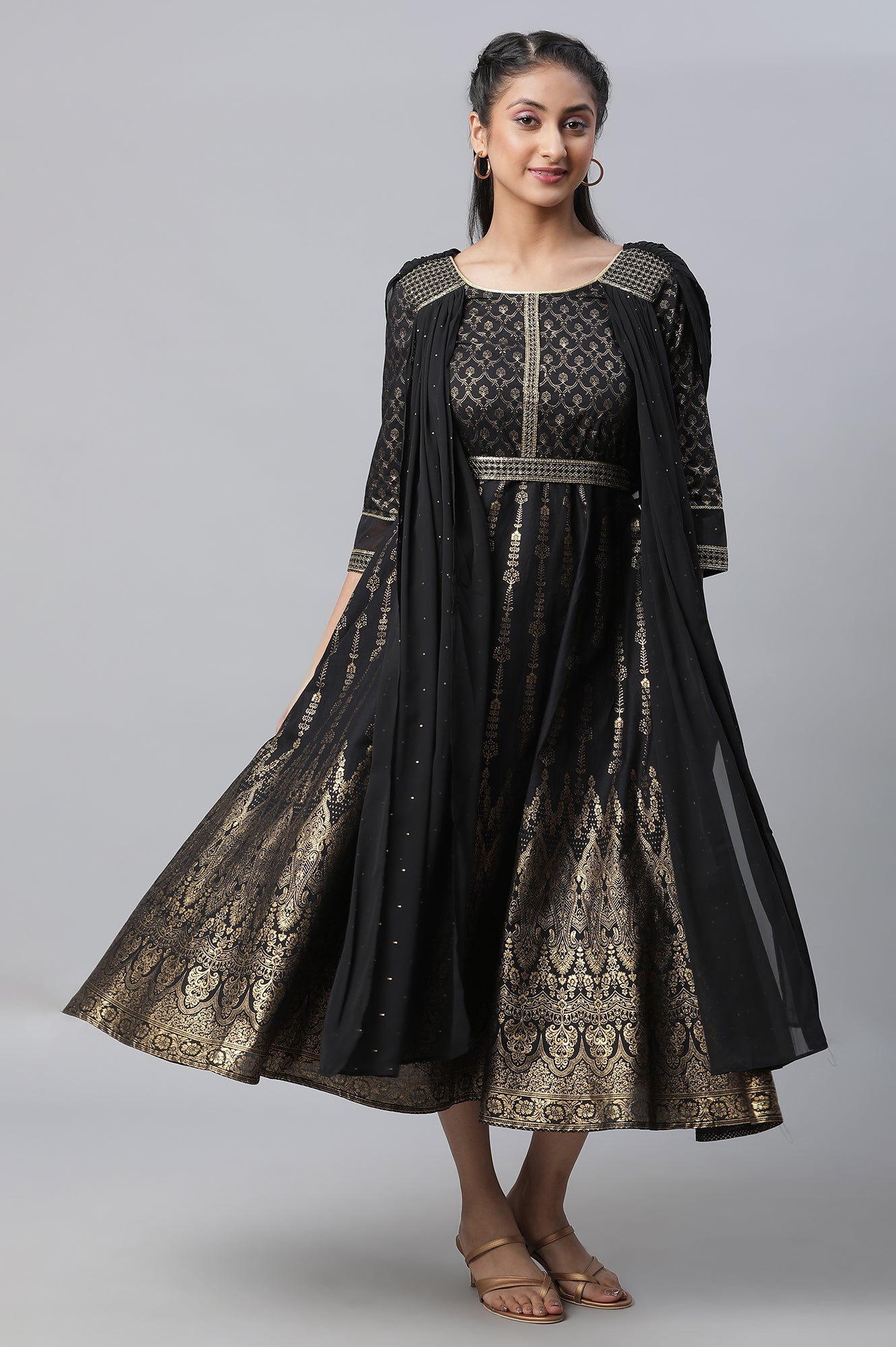 A Placement Printed Dress That Has Fine Gold Sequin And Zari Embroidery On The Shoulder Yoke, Placket, And Sleeves. It Also Has An Embroidered Detachable Belt That Can Be Used To Adjust The Fit Of The Garment. It Comes With An Attached Drape That Converts Into Delicate Cowls At The Back.